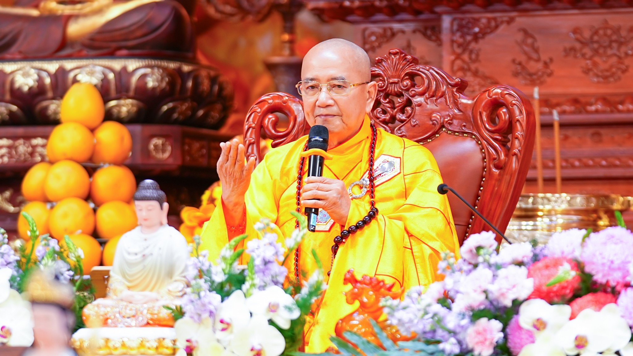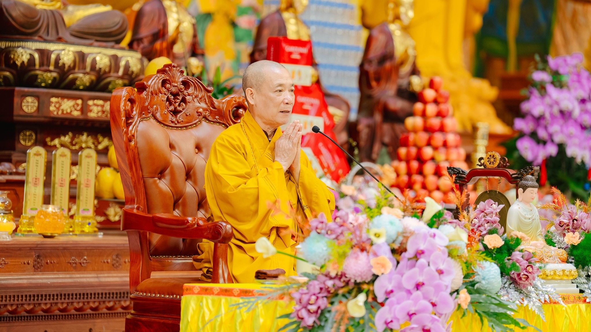 Đặc biệt, sáng ngày 14/03/2026 (26 tháng Giêng năm Bính Ngọ), trong khuôn khổ ngày thứ tám của pháp hội, đạo tràng trang nghiêm cung thỉnh Hòa thượng Thích Khế Chơn – Phó Chủ tịch Hội đồng Trị sự, Trưởng ban Hướng dẫn Phật tử Trung ương GHPGVN quang lâm giảng pháp. Sự hiện diện của Hòa thượng là nhân duyên thù thắng đối với hàng nghìn hành giả đang tu tập tại đạo tràng. Những lời huấn từ sâu sắc nhưng gần gũi của Hòa thượng đã mang lại nhiều bài học quý giá, giúp Phật tử biết cách xây dựng đời sống gia đình hạnh phúc, góp phần xây dựng xã hội an lành.