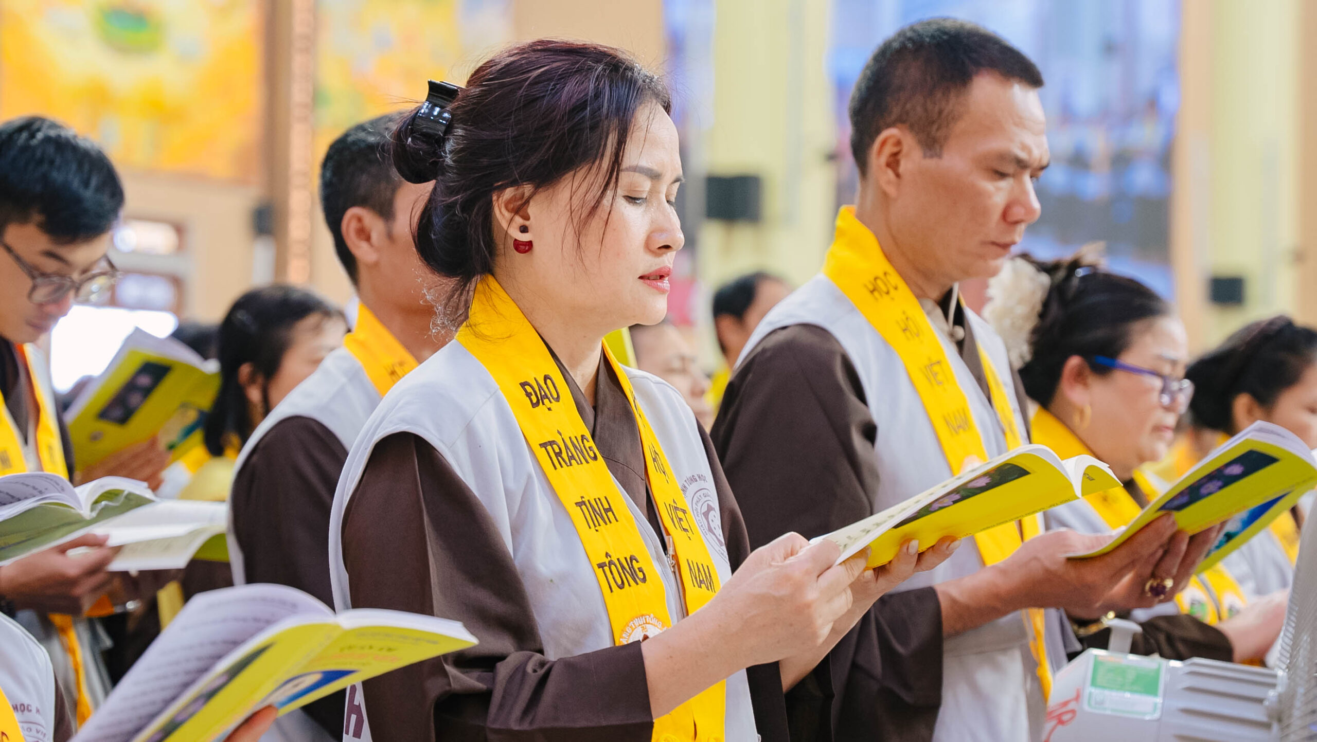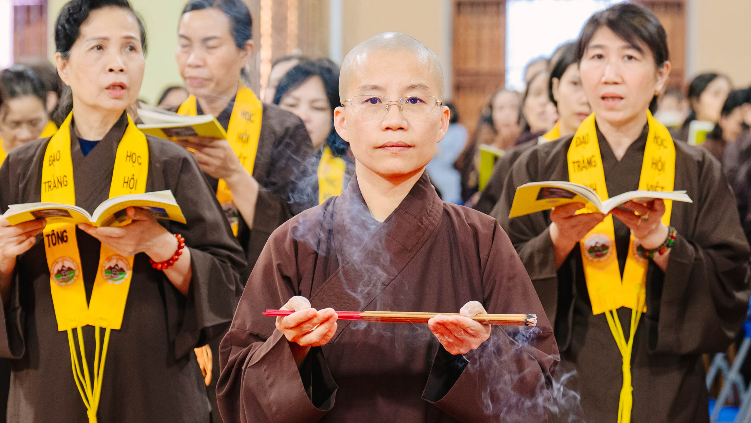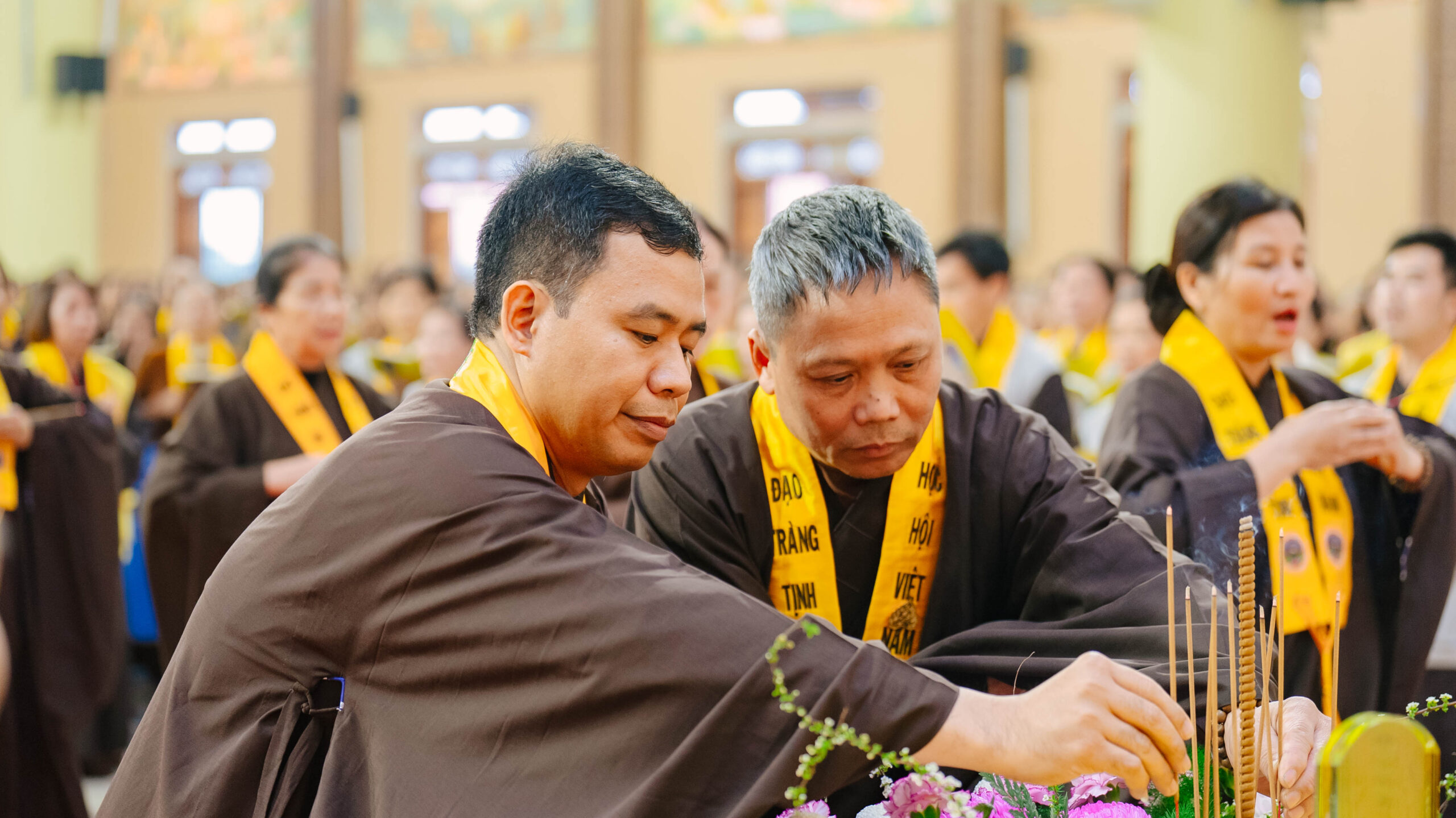 Để pháp hội diễn ra trang nghiêm và thuận duyên, không thể không nhắc đến sự đóng góp thầm lặng của các Ban Hộ tự cùng đông đảo Phật tử phát tâm công quả. Nhiều sinh viên tình nguyện thuộc CLB Thanh thiếu niên Phật tử Hương Từ Bi cùng sinh viên Trường Đại học Y học Cổ truyền và Đại học Thương mại đã tham gia chấp tác tại Ban Hậu cần và Ban Sớ điệp. Từ việc hướng dẫn Phật tử, sắp xếp đạo tràng đến chuẩn bị hậu cần, từng phần việc đều được các đạo hữu đảm trách tỉ mỉ với tinh thần “Phụng sự chúng sinh là thiết thực cúng dường chư Phật”. Dù là những công việc âm thầm nhưng đầy ý nghĩa, góp phần làm nên sự thành công và trang nghiêm của pháp hội.