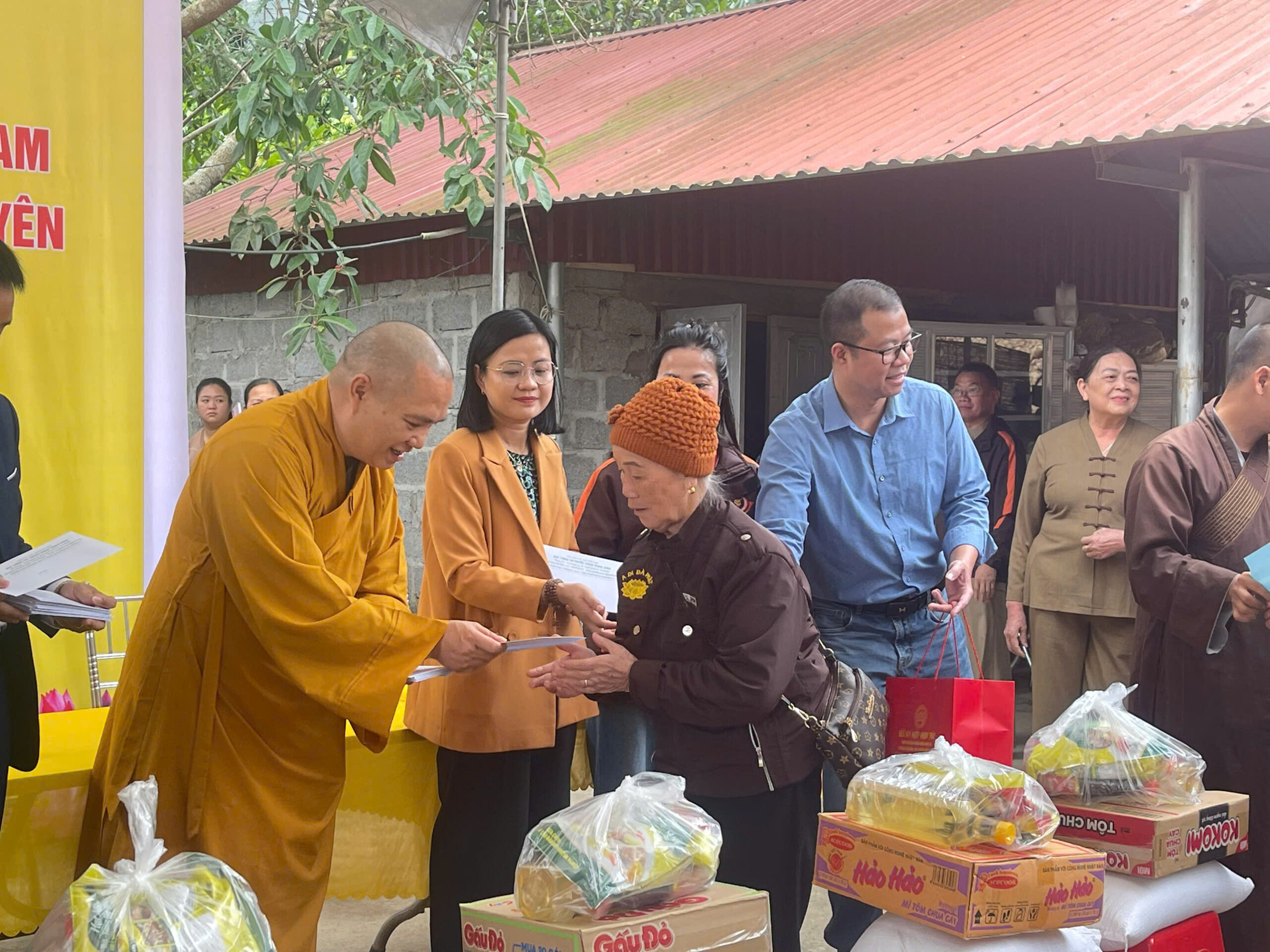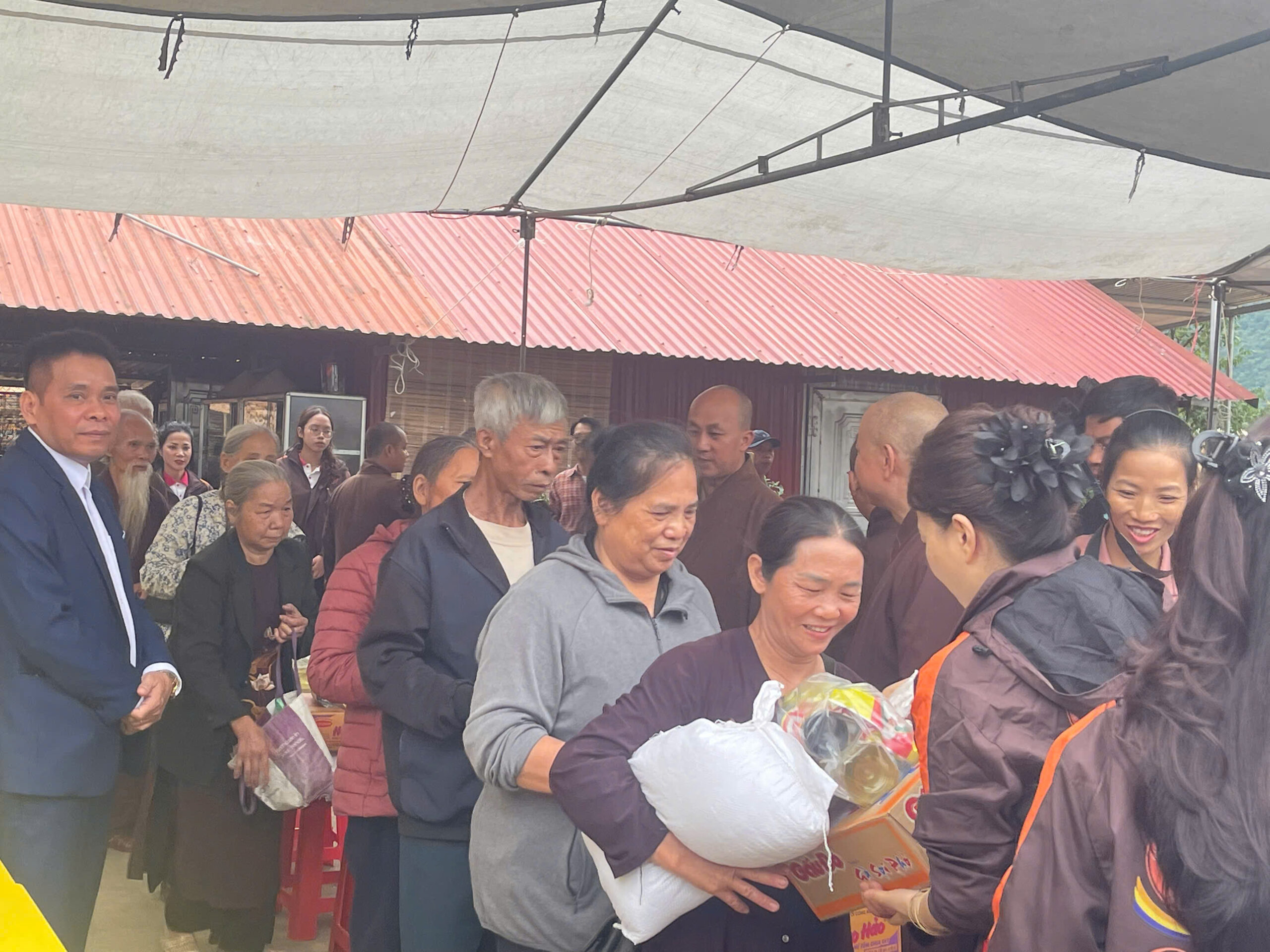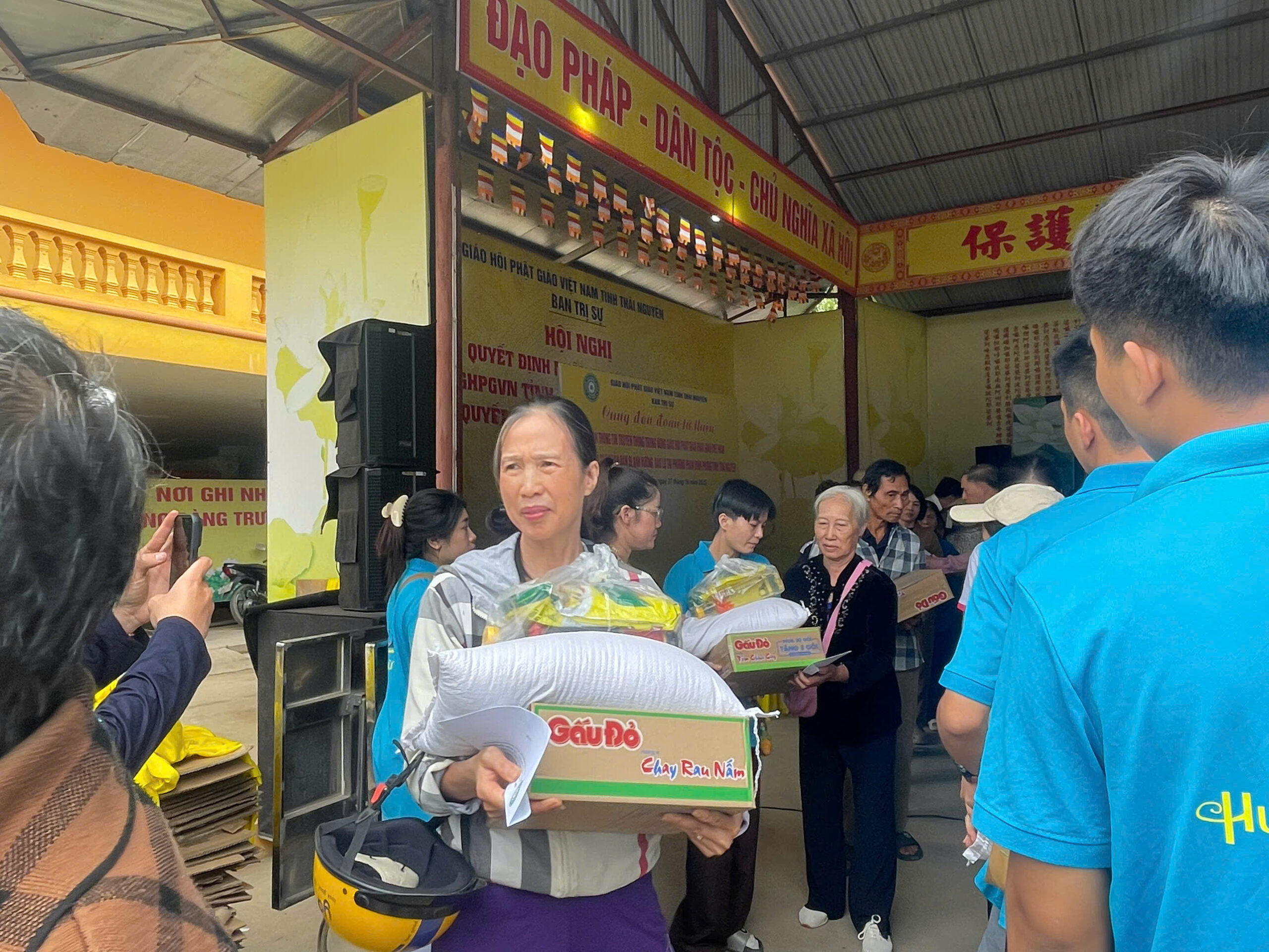 Cùng với đó, đoàn trao tặng 400 phần quà đến bà con tại chùa Xả (xóm Thái Long, xã Võ Nhai) và chùa Phù Liễn (phường Hoàng Văn Thụ, TP. Thái Nguyên). Mỗi phần quà gồm tiền mặt và các nhu yếu phẩm thiết yếu như gạo, muối, hạt nêm, mì tôm… với tổng giá trị khoảng 600 triệu đồng. Những phần quà giản dị nhưng chứa đựng tình người sâu sắc đã mang đến niềm vui và sự ấm áp cho bà con. Khi nhận quà, nhiều người không giấu được niềm xúc động, đôi mắt rạng ngời hy vọng, nụ cười hé mở trên môi giữa những khó khăn sau thiên tai.