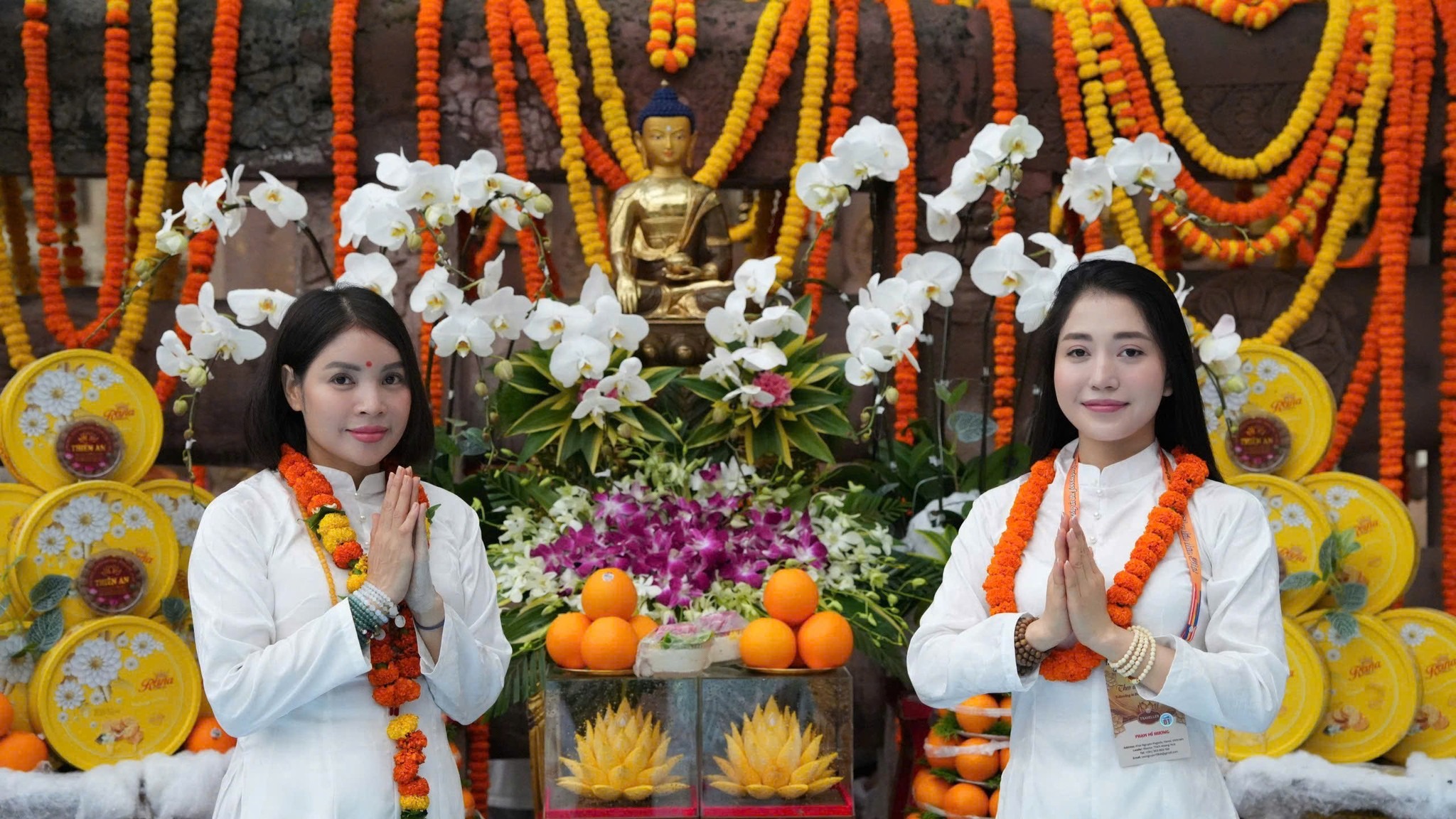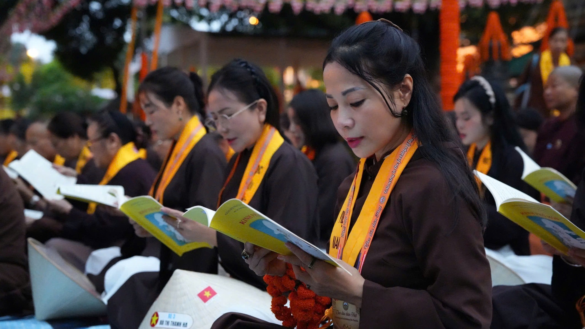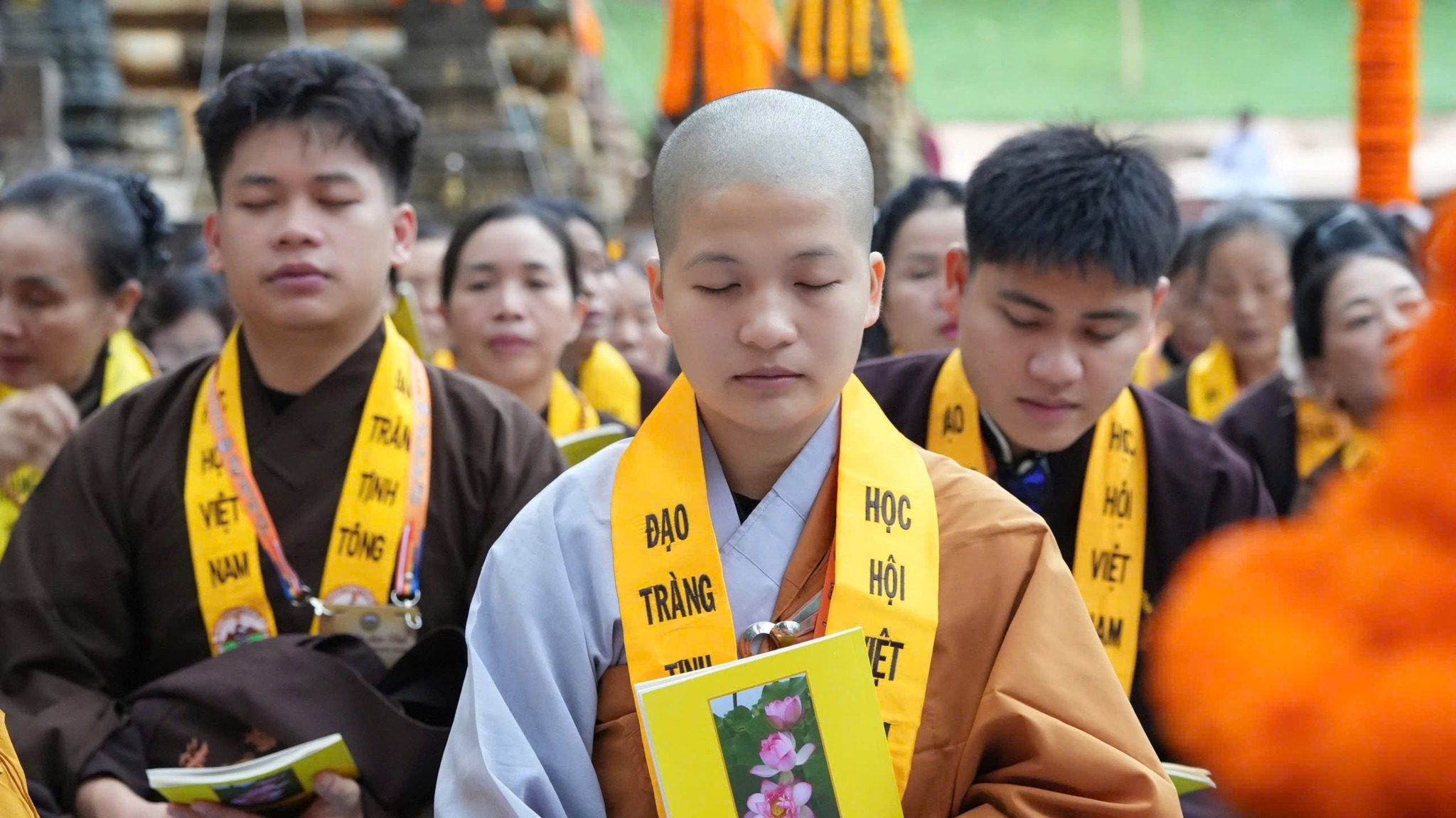 Trong không khí trang nghiêm, đại chúng đồng quỳ đảnh lễ, chắp tay dâng lời nguyện cầu: “Nguyện theo dấu chân Phật, đoạn trừ mọi cực đoan và dục lạc, trở về nẻo Trung đạo; để thân tâm luôn vững chãi, an lạc và tỉnh thức giữa dòng đời nhiều biến động.”