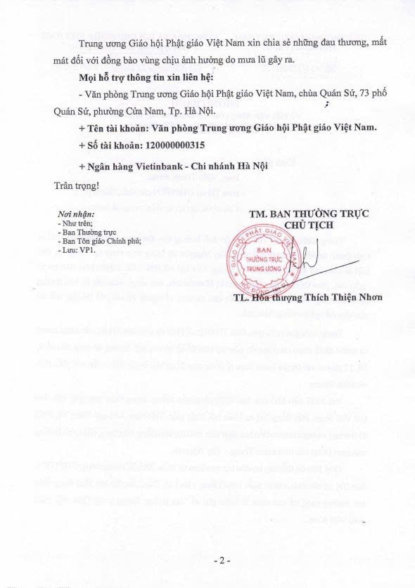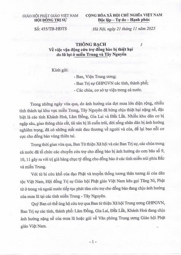 Cùng ngày, Trưởng lão Hòa thượng Thích Thiện Nhơn, Phó Pháp chủ Hội đồng Chứng minh, Chủ tịch Hội đồng Trị sự ấn ký Thông bạch số 455/TB-HĐTS ngày 21-11-2025, vận động cứu trợ đồng bào bị thiệt hại do lũ lụt ở miền Trung và Tây Nguyên. Theo đó, thông bạch gửi đến các Ban, Viện Trung ương; Ban Trị sự Giáo Hội Phật Giáo Việt Nam các tỉnh, thành phố; các chùa, cơ sở tự viện trong cả nước, nhận định:
